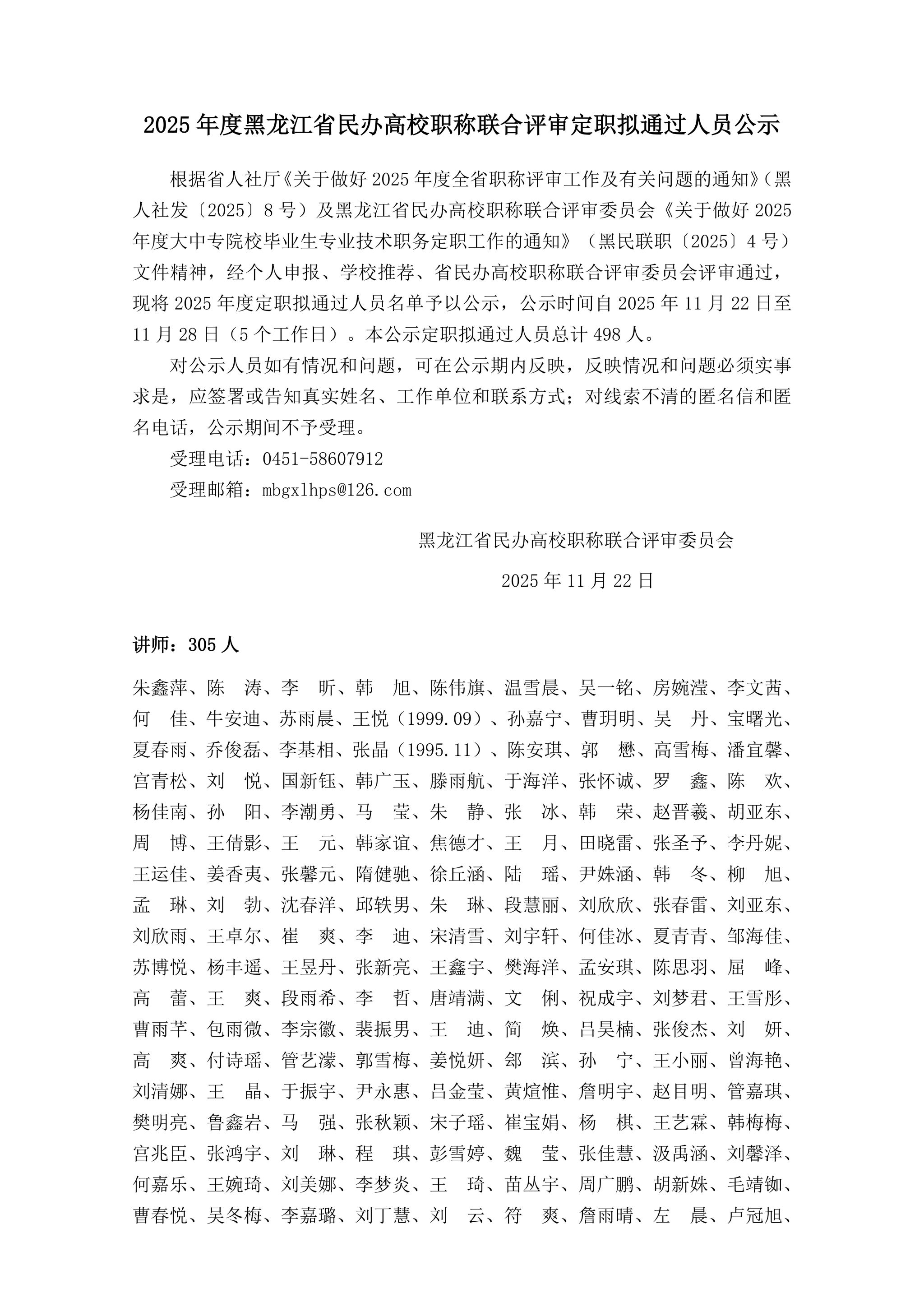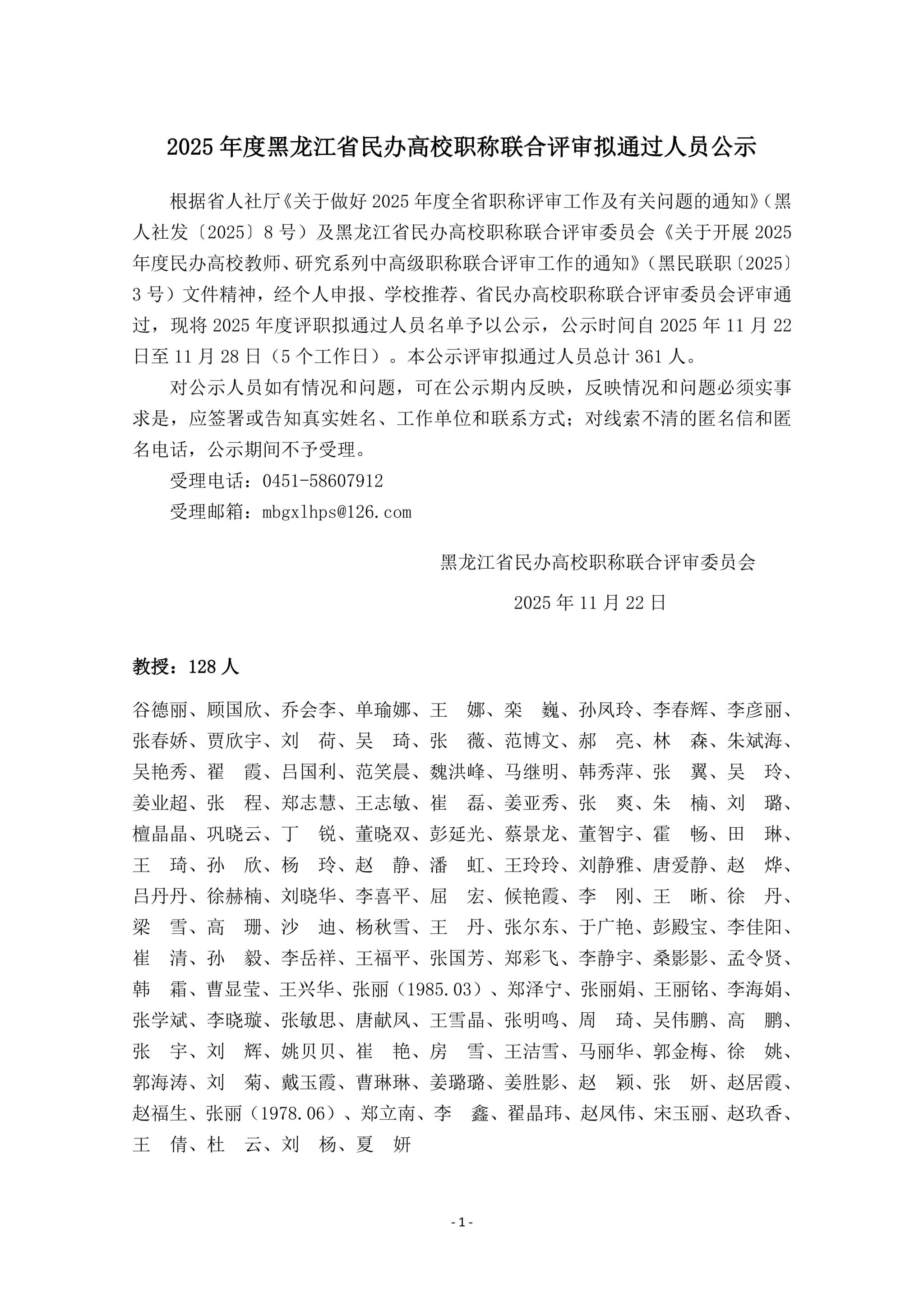 根据黑龙江省民办高校职称联合评审委员会下发的《2025年度黑龙江省民办高校职称联合评审拟通过人员公示》文件,按照黑龙江省民办高校职称联合评审委员会要求,对2025年度评职拟通过人员名单予以公示,公示时间自2025年11月22日至11月28日(五个工作日)。具体如下: