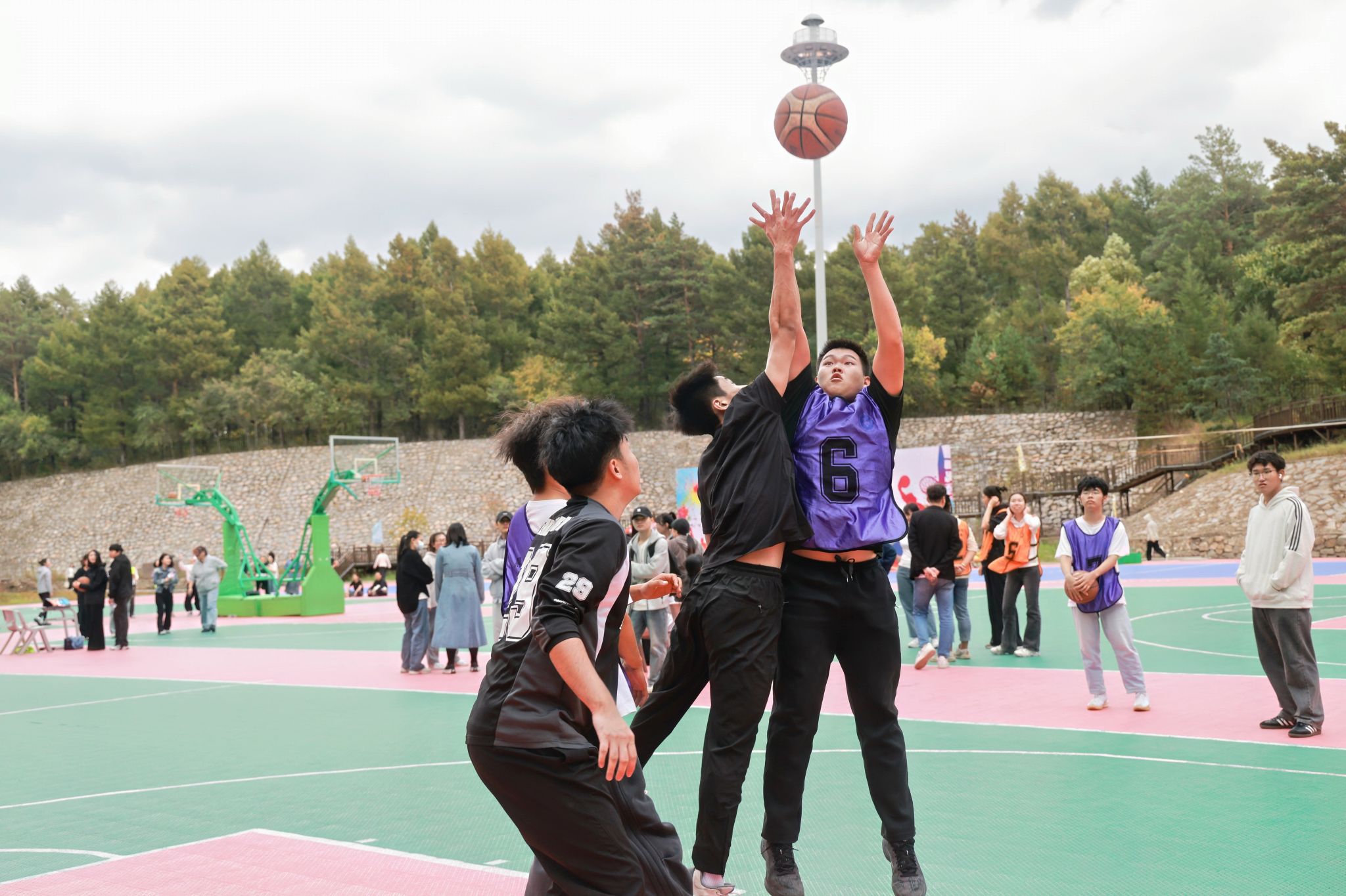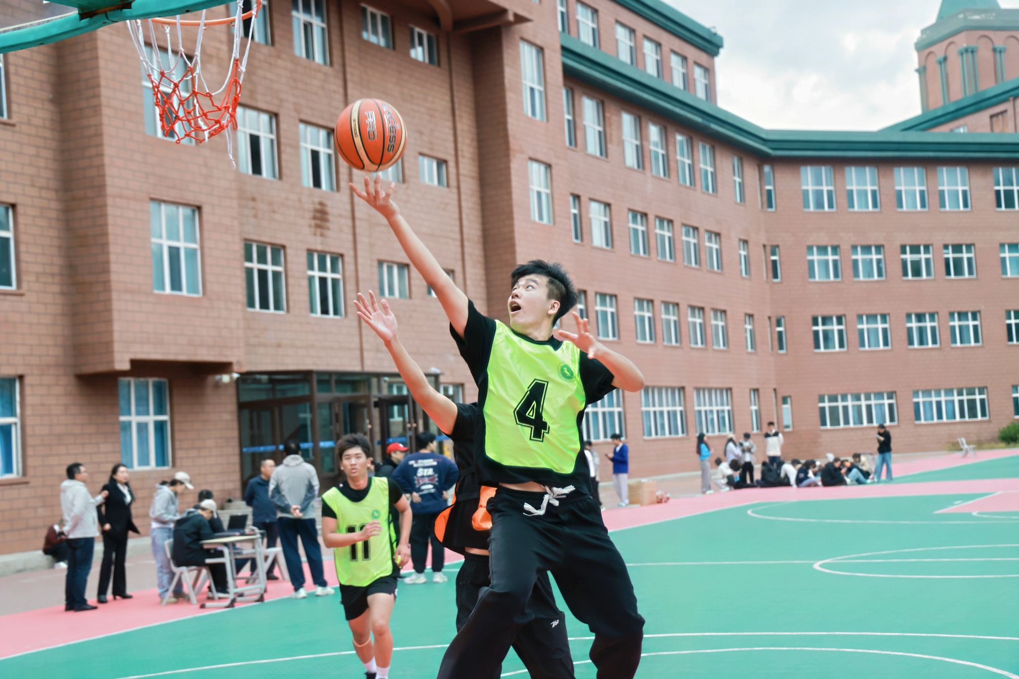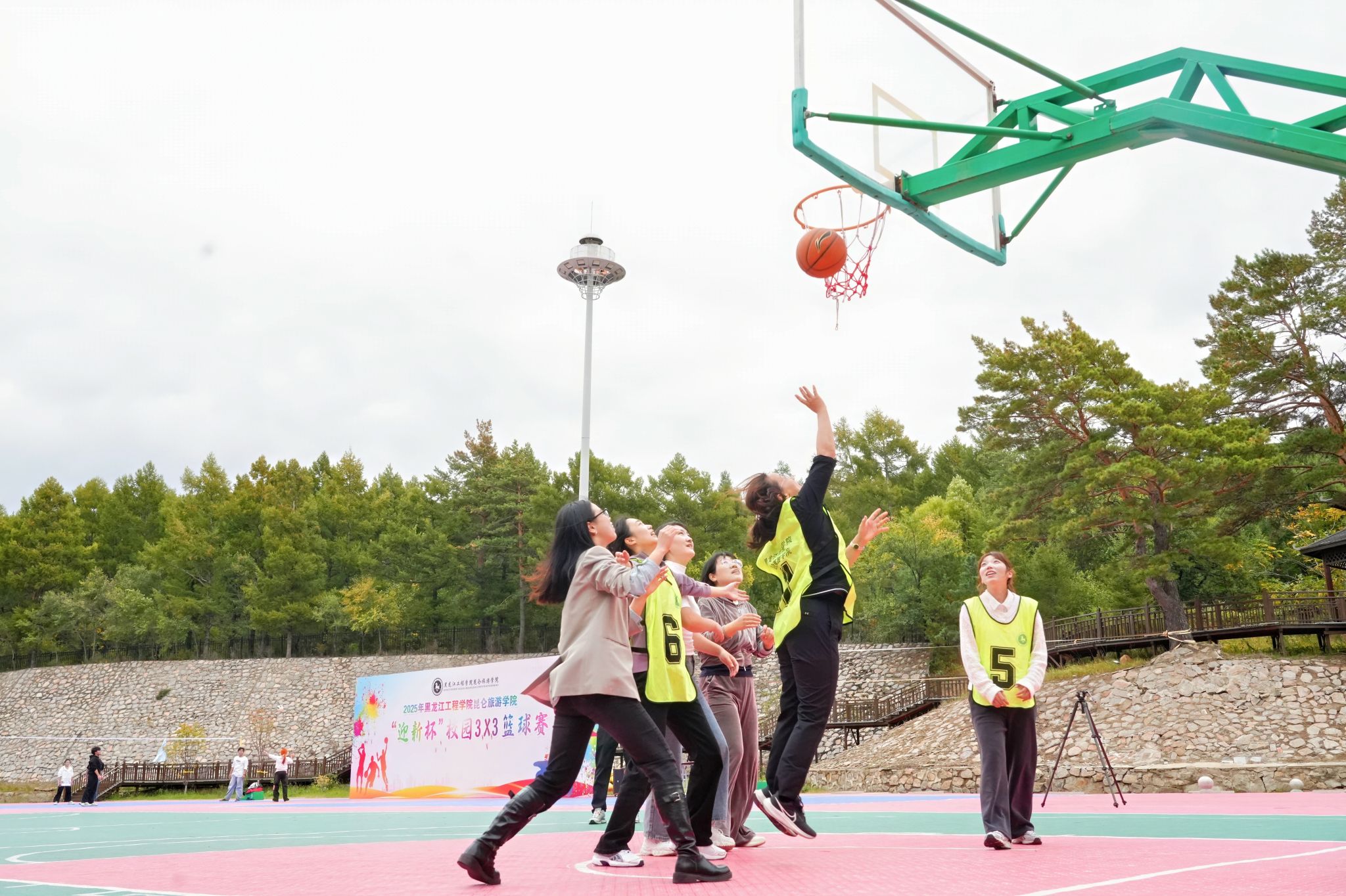 自9月15日起,每日午间的篮球场都焕发着勃勃生机。教工组的比赛中,老师们展现出课堂外的别样风采。一位老师稳健地运球突破,巧妙分球给同事,后者果断跳投命中,引得场边学生连连叫好。新生组的赛场更是朝气蓬勃,男生们奋力拼抢篮板,女生们精准投篮得分。场边围满了观众,有捧着课本驻足观看的同学,有下课路过被精彩对决吸引的辅导员。每一次精彩的传球配合,每一个漂亮的进球,都会引发阵阵掌声与欢呼。