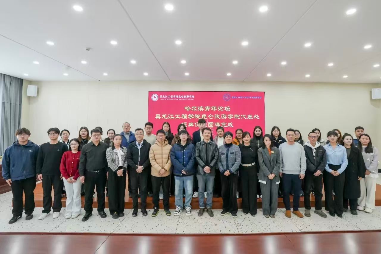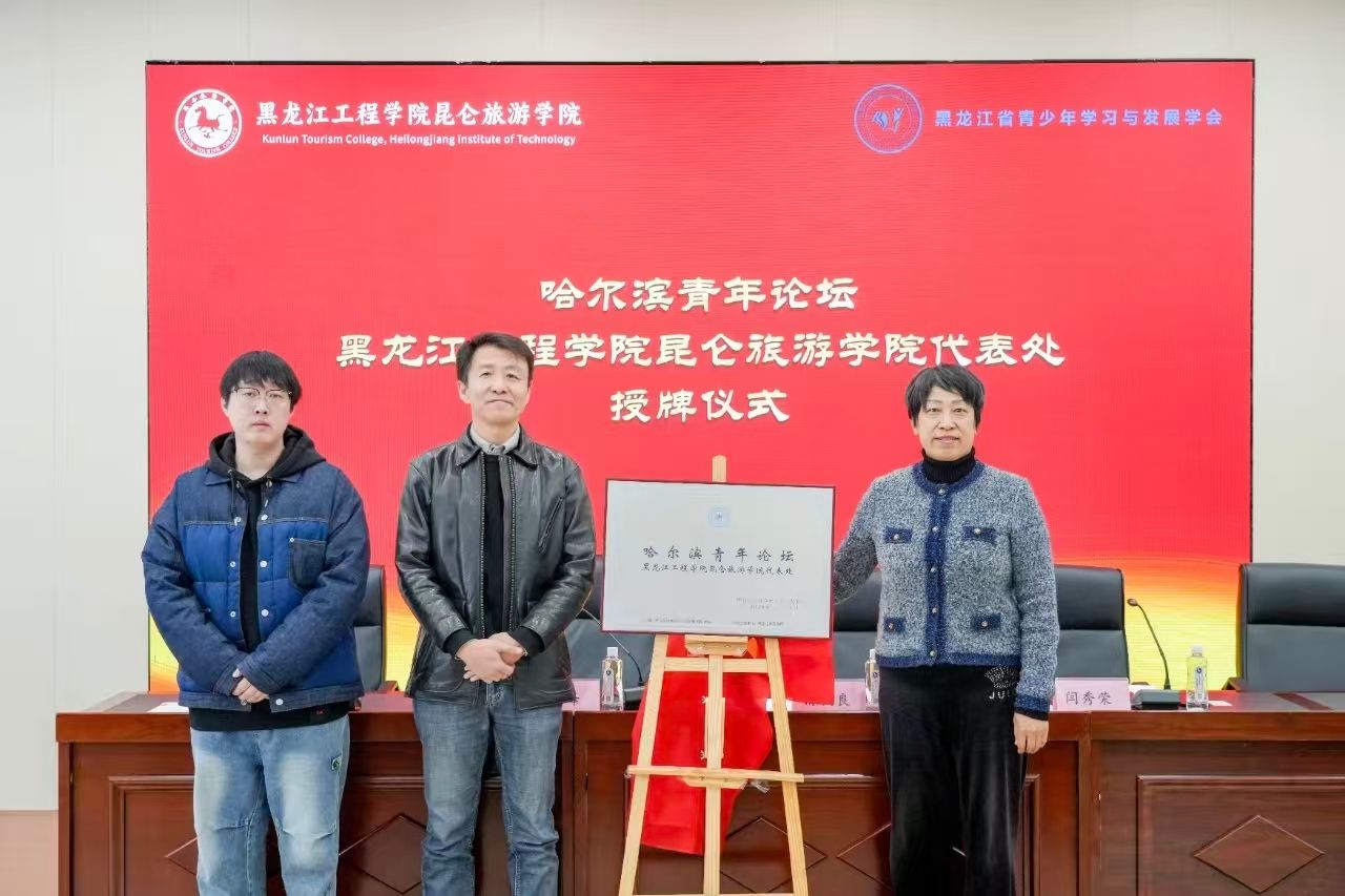 在与会嘉宾的共同见证下,李峰会长向我校授予"哈尔滨青年论坛黑龙江工程学院昆仑旅游学院代表处"牌匾。