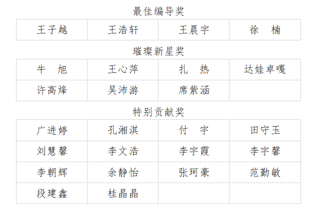 为表彰在迎新晚会中表现卓越的个人及集体,树立典范,弘扬先进,经各系推荐、校级评审,现将黑龙江工程学院昆仑旅游学院2025-2026学年度迎新晚会“最佳编导奖”“璀璨新星奖”“特别贡献奖”表彰结果公示如下(按姓氏笔画排序):