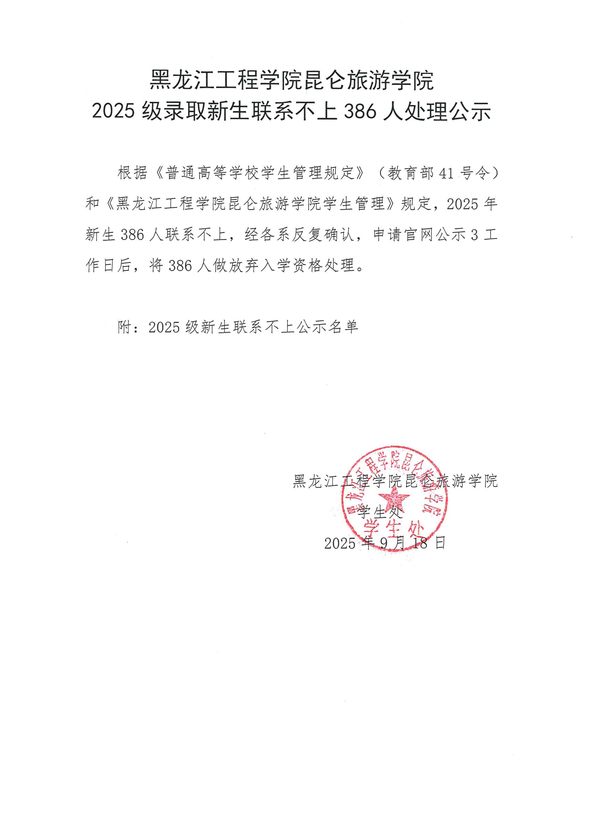 黑龙江工程学院昆仑旅游学院2025级录取新生联系不上386人处理公示