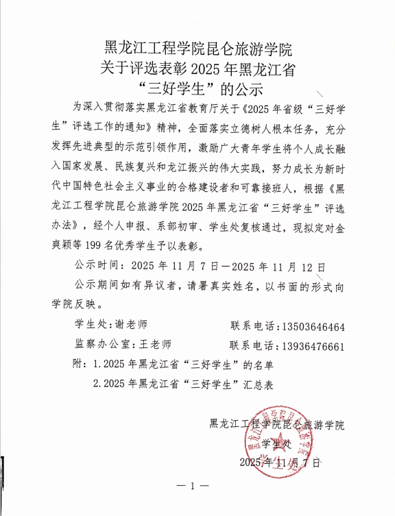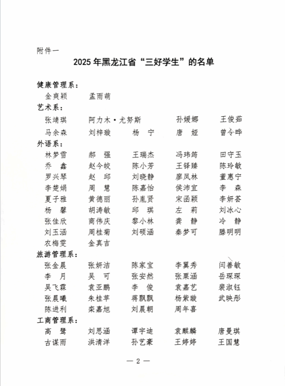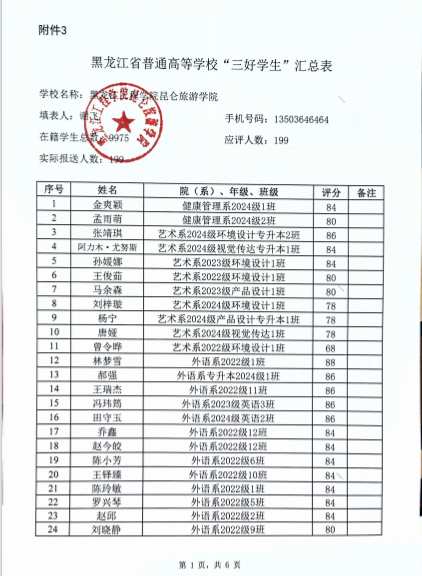 黑龙江工程学院昆仑旅游学院关于评选表彰2025年黑龙江省“三好学生”的公示