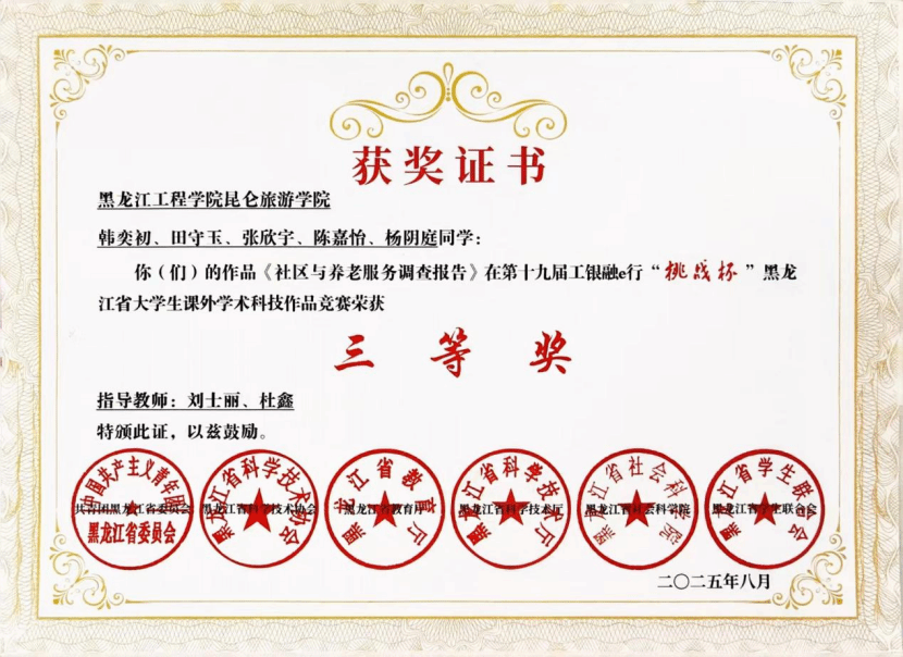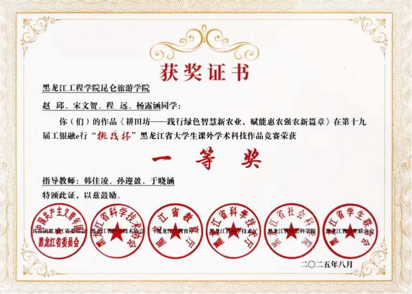 近日,第十九届工银融e行“挑战杯”黑龙江省大学生课外学术科技作品竞赛获奖名单正式揭晓。经过激烈角逐,我校参赛团队表现优异,共获省级一等奖1项、二等奖1项、三等奖2项,取得在该项赛事中的新突破。同时,三位指导教师荣获“优秀指导教师”称号,体现了我校在科技创新教育和人才培养方面的扎实成效。