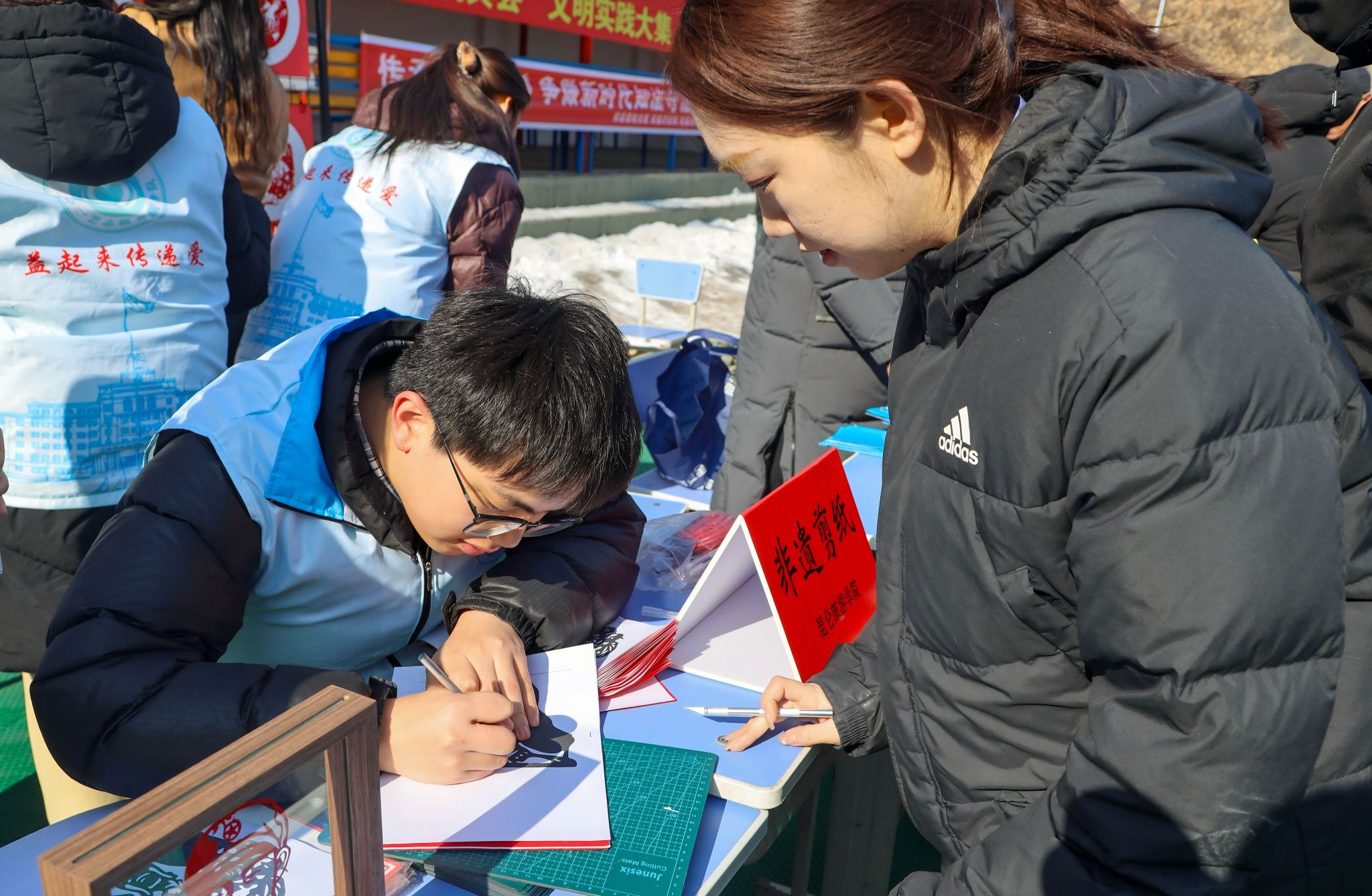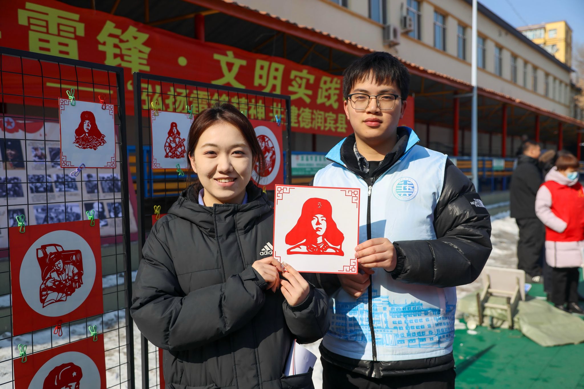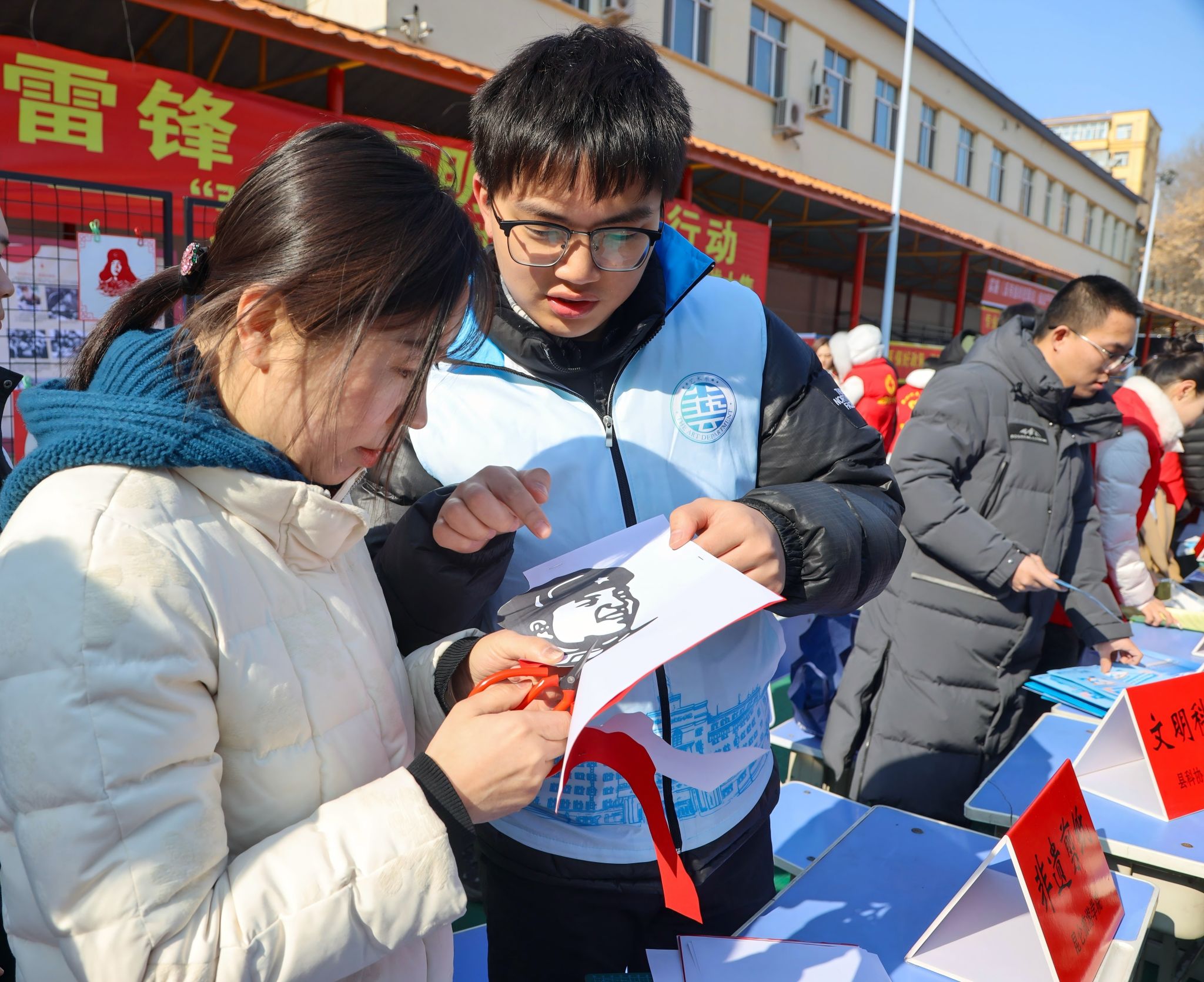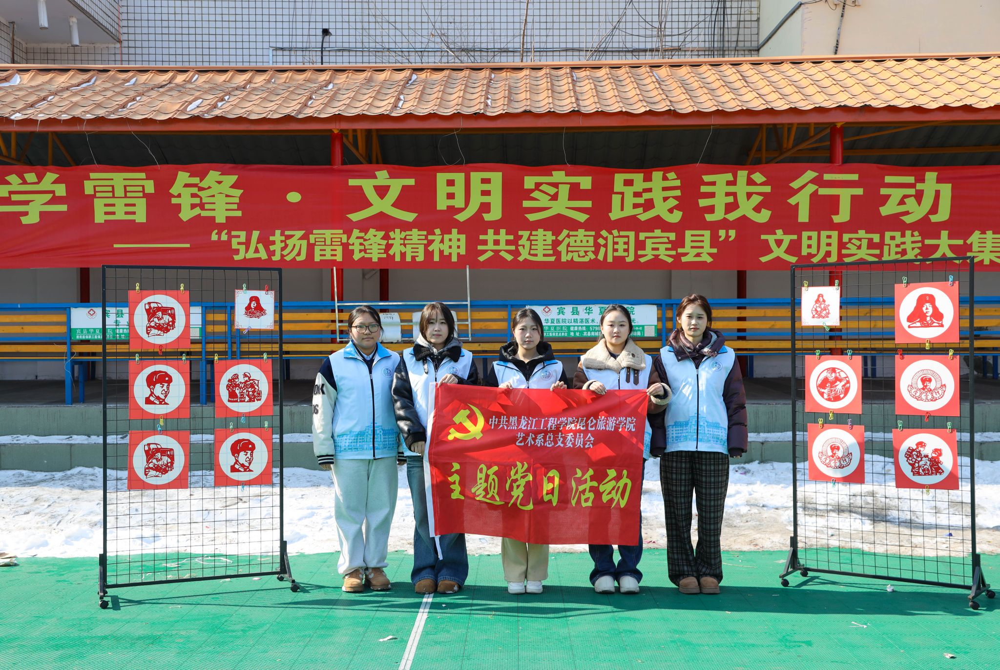 为深入贯彻落实习近平总书记关于弘扬雷锋精神的重要指示,推动志愿服务与传统文化传承深度融合,艺术设计学院学生党支部于2026年3月5日应邀宾县新时代文明实践中心参加“3.5学雷锋”文明实践大集活动。以非遗剪纸艺术为载体,开展了一场别开生面的红色文化传承实践。