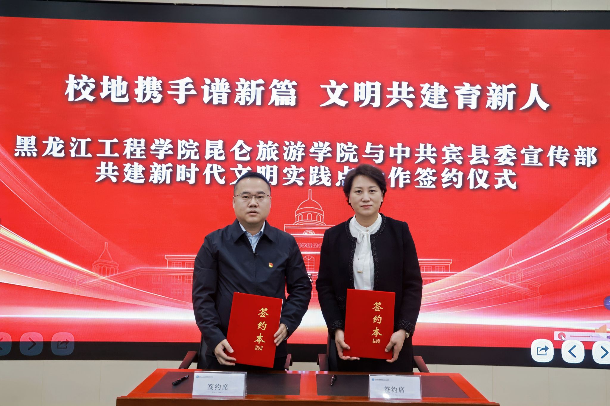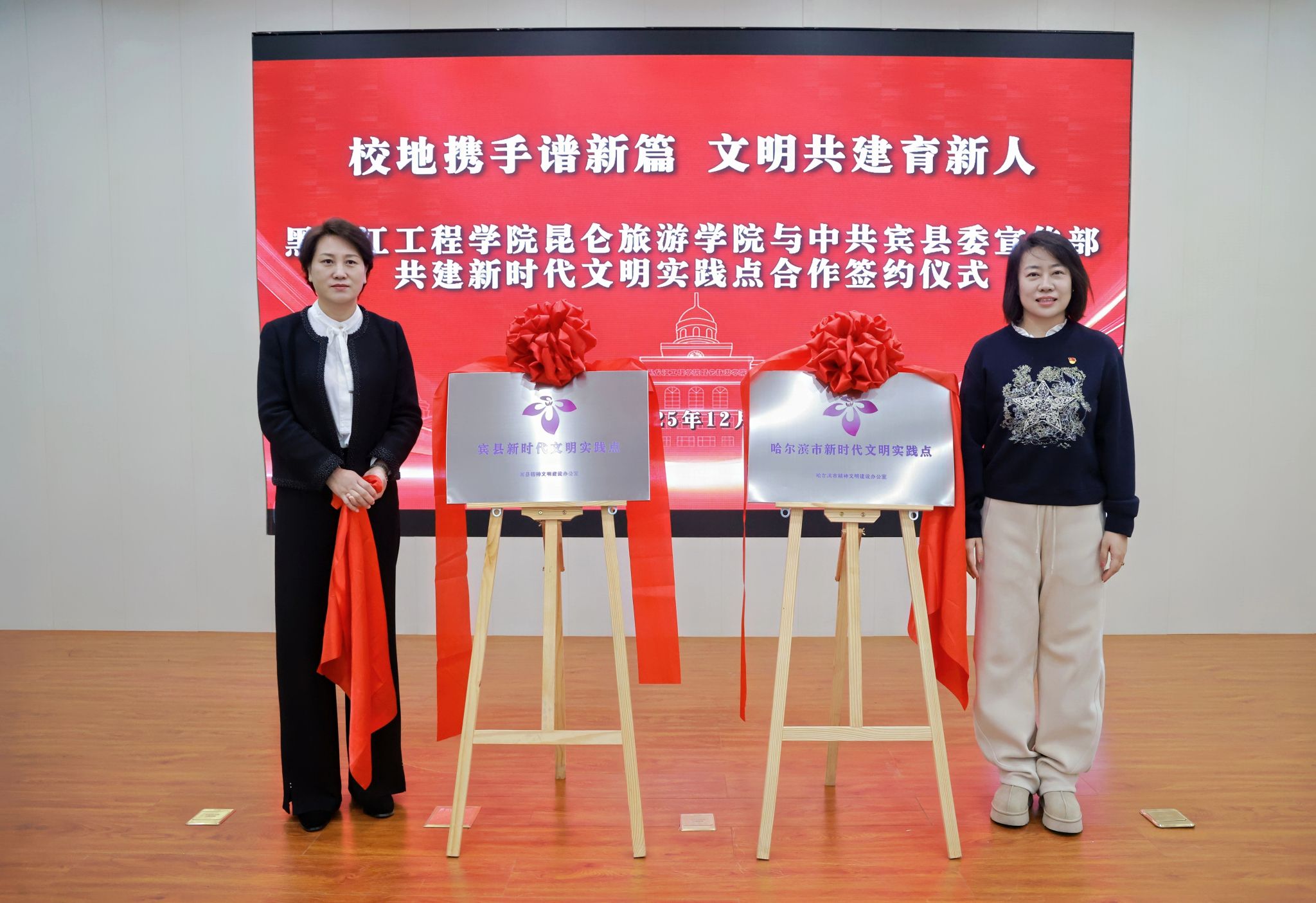 在双方与会人员的见证下,武录齐与刘雅晶共同签署了共建协议。随后,刘雅晶与郭林燕共同为“哈尔滨新时代文明实践点”与“宾县新时代文明实践点”揭牌。
