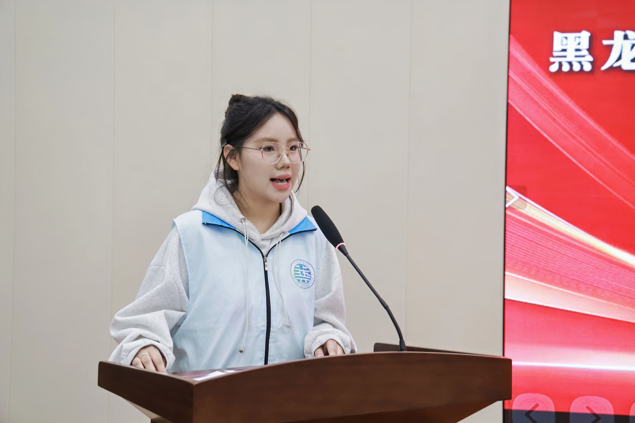 中共宾县文明实践科室负责人付久洲与校团委副书记韩佳凌共同为在宾县志愿服务中表现突出的学生代表颁发了荣誉证书。优秀志愿者代表艺术系李依丹同学现场分享了参与志愿服务的心得与成长。