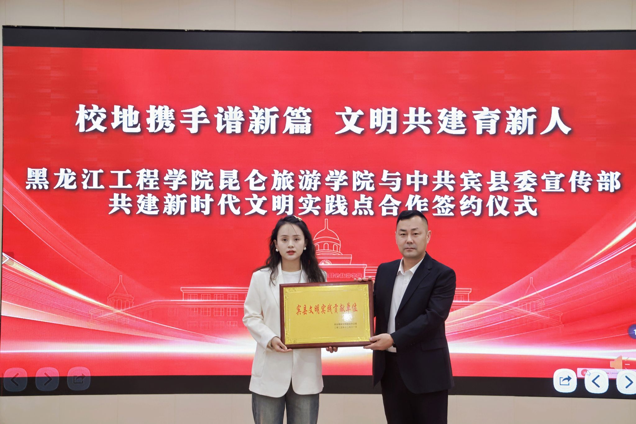 中共宾县委宣传部授予我校“宾县文明实践贡献单位”荣誉称号,由艺术系学生支部书记高嵩代表学校接牌。