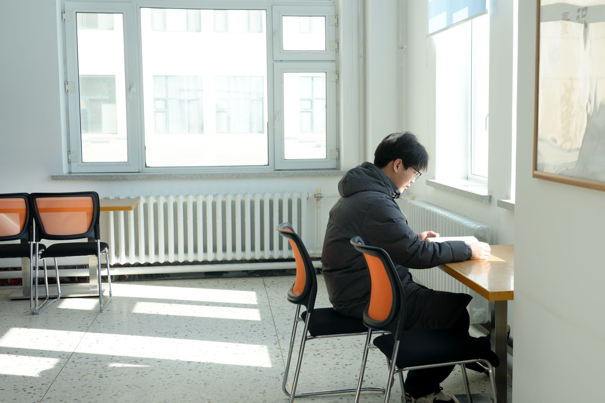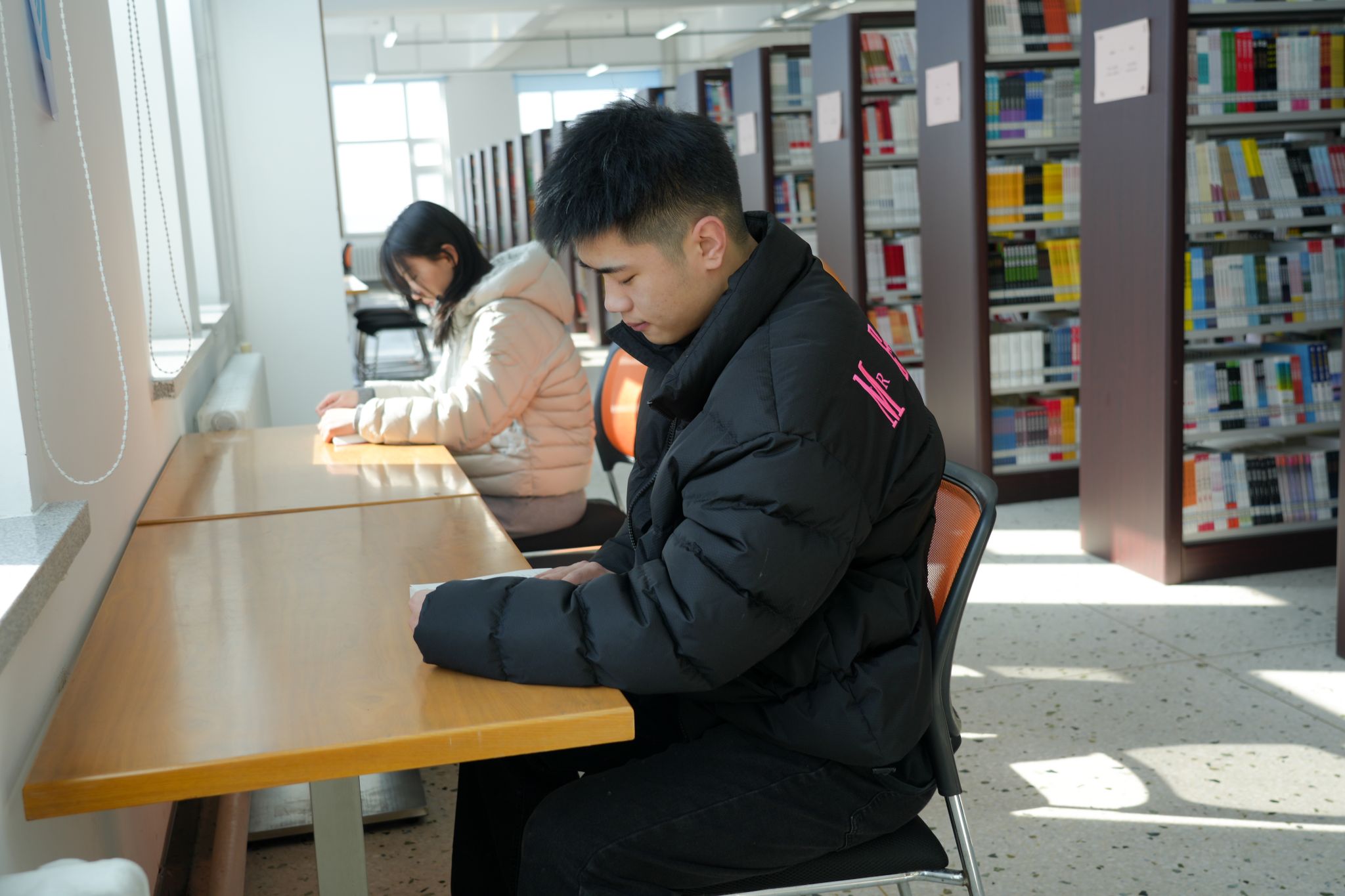 傍晚了,图书馆里的人还没散。有人在复习功课,有人在翻刚借的小说,有人趴在桌上小憩。窗外偶尔吹进来一阵风,屋里暖洋洋的。