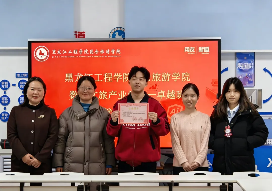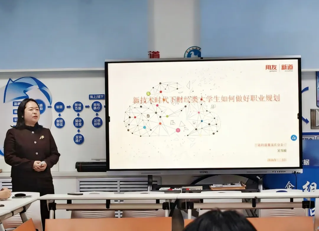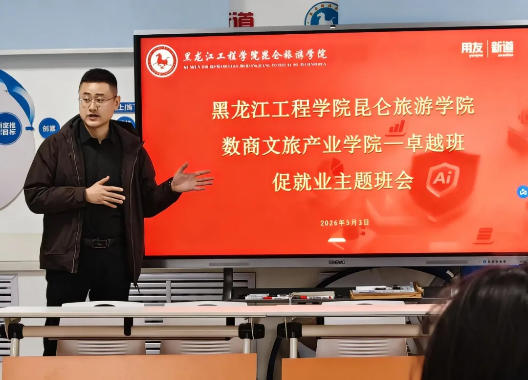 3月3日,数商文旅产业学院联合用友新道科技股份有限公司黑龙江分公司,为卓越班28名学生开展了“数智赋能,职引未来”促就业与职业规划主题班会。本次活动将企业视角的就业指导作为新学期的重要一课,以校企协同的方式,为学生的职业规划提供针对性指导,正式开启了新学期促就业系列工作。用友新道科技黑龙江分公司总经理王宏伟、助理总经理吴雪凌、校企合作经理王达等企业嘉宾亲临现场,为同学们带来了兼具行业洞察与实践经验的就业指导分享。