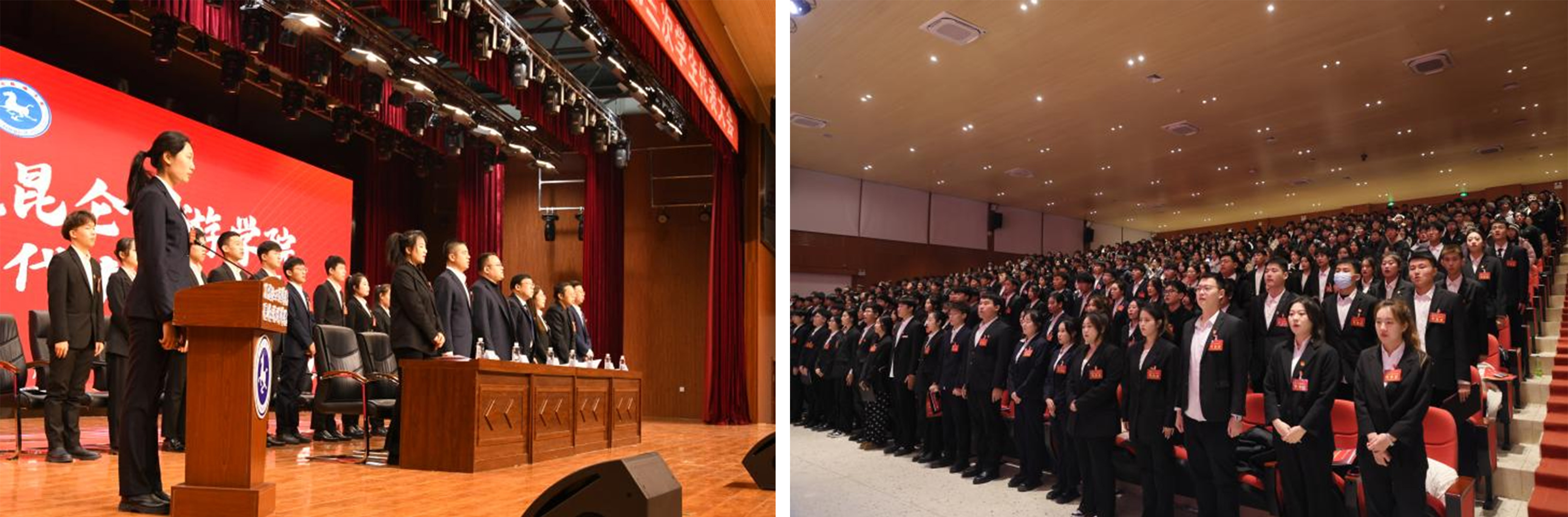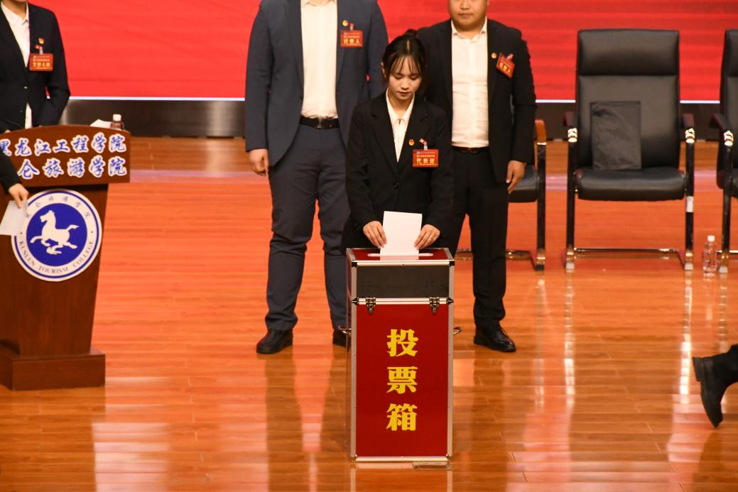 在庄严的国歌声中黑龙江工程学院昆仑旅游学院第三次学生代表大会拉开序幕。