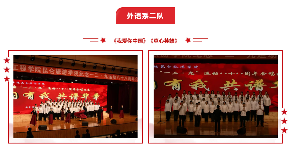 铿锵洪亮的歌声传达出了我校青年学子“请党放心 强国有我”的壮志雄心;一个个优美舒展的旋律,一首首信念坚定的歌声,淋漓尽致地表达了我校青年学子细腻而真挚的爱党爱国之情。热血沸腾的演唱,情感饱满的朗诵、形式丰富的表演将比赛一次次推向高潮。