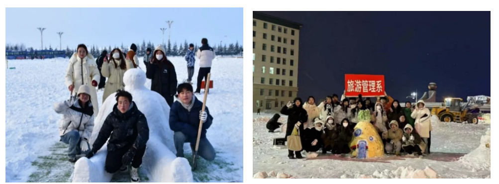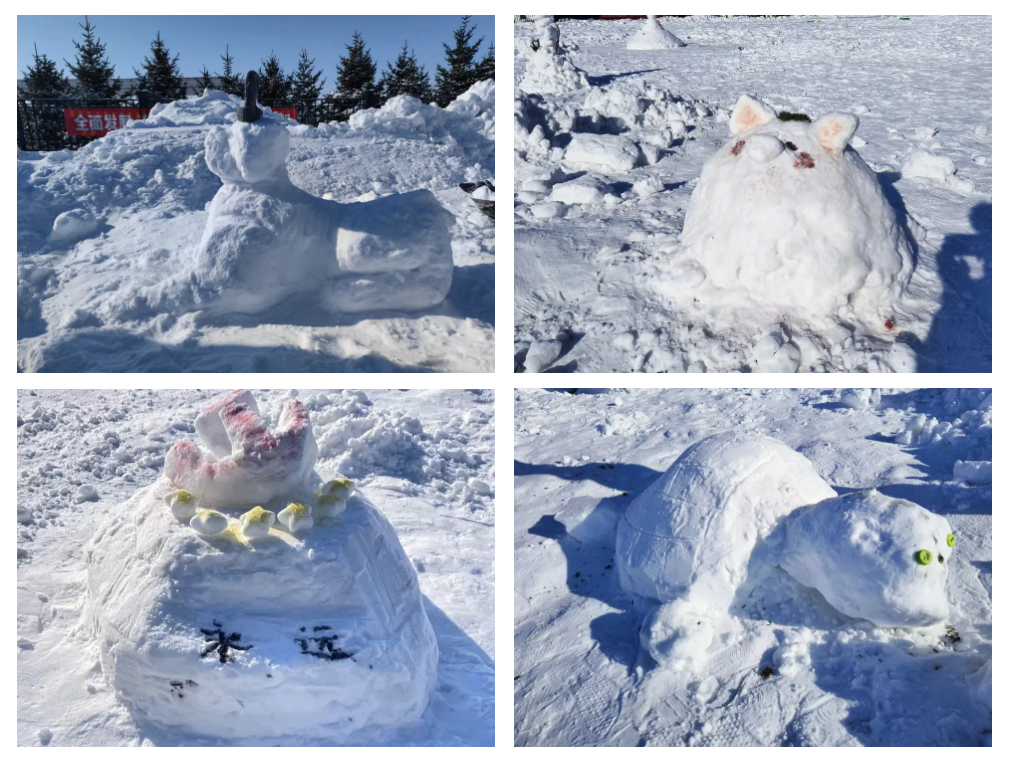 完成作品后同学们开心地和自己的作品合影留念,尽情享受着堆雪人比赛带来的激情与快乐。