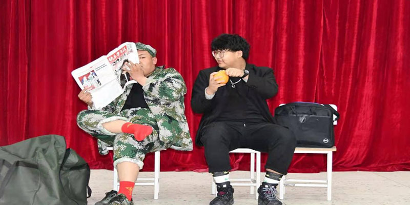 其次由艺术系同学为大家带来的默剧《城里人与乡下人》,他们通过滑稽的人物形象,无声的表演,意气风发的城里人与憨厚朴实的乡下人在候车室里碰撞出一段神奇的美食之旅,使观众捧腹大笑。